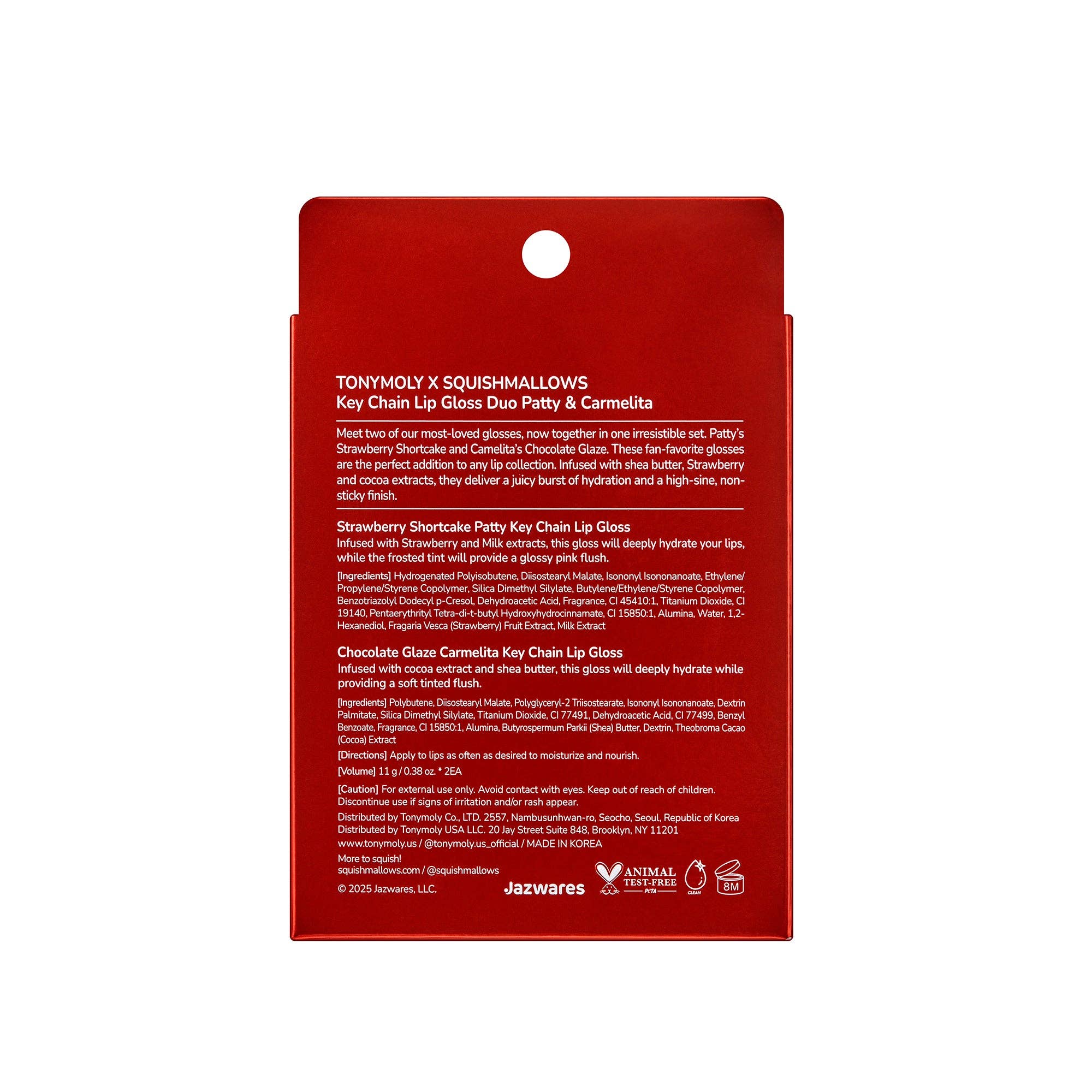 Shine bright this season with the TONYMOLY x Squishmallows Lip Gloss Duo! This limited-edition set features two fan-favorite glosses: Patty’s sweet Strawberry Shortcake and Carmelita’s decadent Chocolate Glaze. Infused with shea butter, cocoa, and fruit extracts, these glosses deliver a smooth, hydrating formula with a high-shine, non-sticky finish. Clip them on your bag or keys for holiday-ready lips anytime, anywhere!